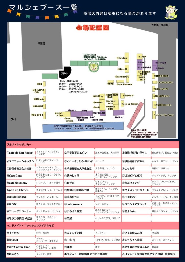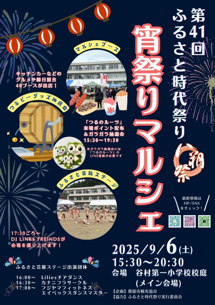 第41回ふるさと時代祭り(八朔祭) 「宵祭りマルシェ」出店一覧について! 投稿日2025年9月4日2025年9月4日投稿者都留市観光協会 開催日時:令和7年9月6日(土)15時30分〜20時30分 会 場:谷村第一小学校校庭(山梨県都留市上谷1-1-2